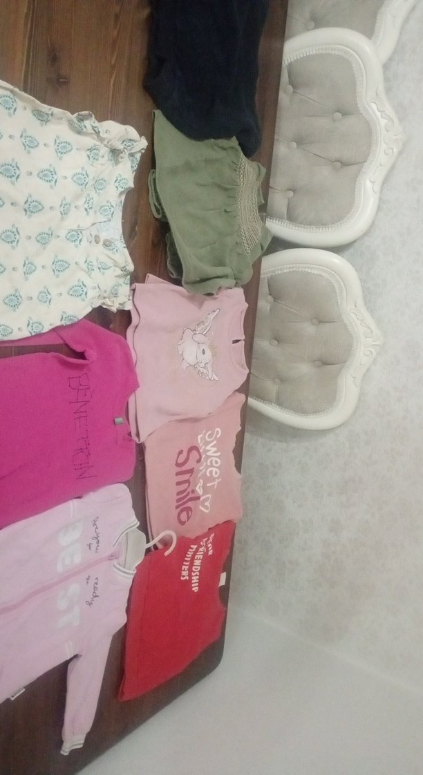 Pastel pembe renkte, kısa kollu ve düğmeli bebek kız takımı. Üzerinde baskılı desenler ve 'Sweet' yazısı bulunur. hepsi bilindik markalar ve temiz