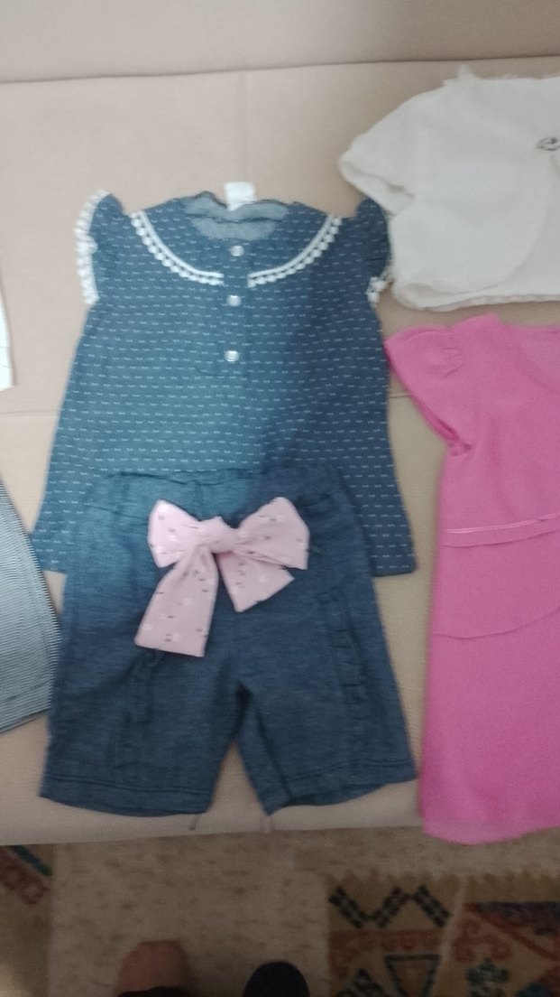 Pembe kısa kollu ve fiyonklu üst ile büyük pembe fiyonk detaylı koyu renk şorttan oluşan bebek kız takımı.