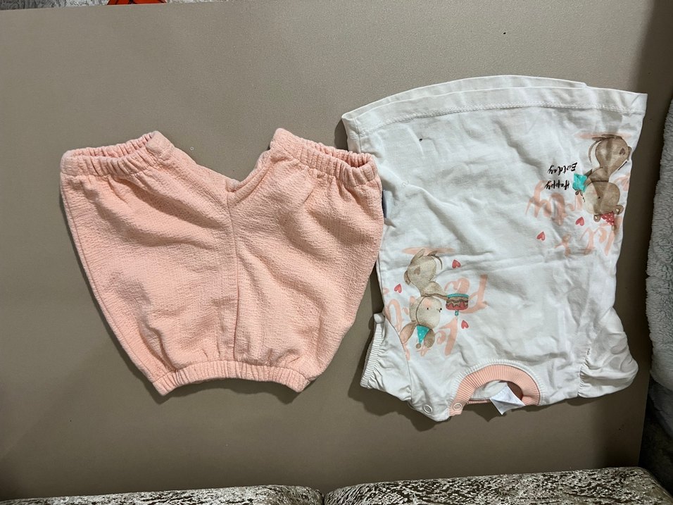 Pastel pembe renkli, kısa kollu sevimli hayvan baskılı üst ve elastik bel detaylı şortlu bebek kız takımı.