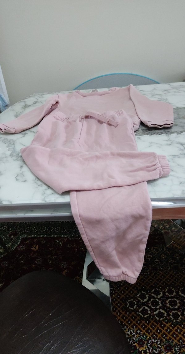 Pastel pembe, kız kıyafeti. Uzun kollu üst ve lastikli paçalı pantolondan oluşur.