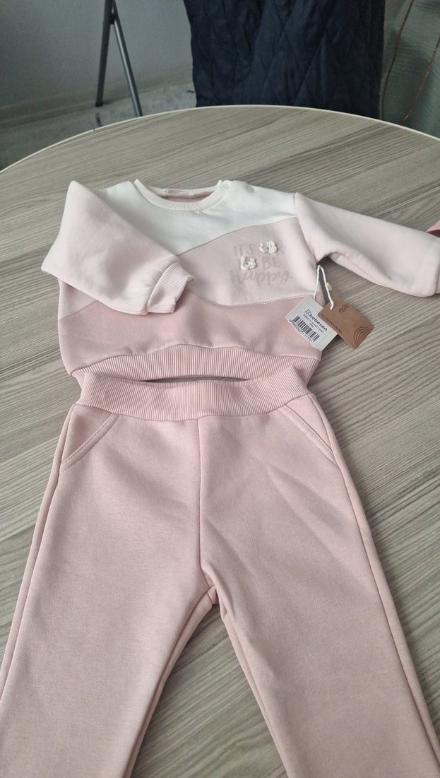 Pastel pembe renkte, uzun kollu ve baskılı desenli bebek kız takımı. Rahat kumaşıyla zahmetsiz şıklık sunar.