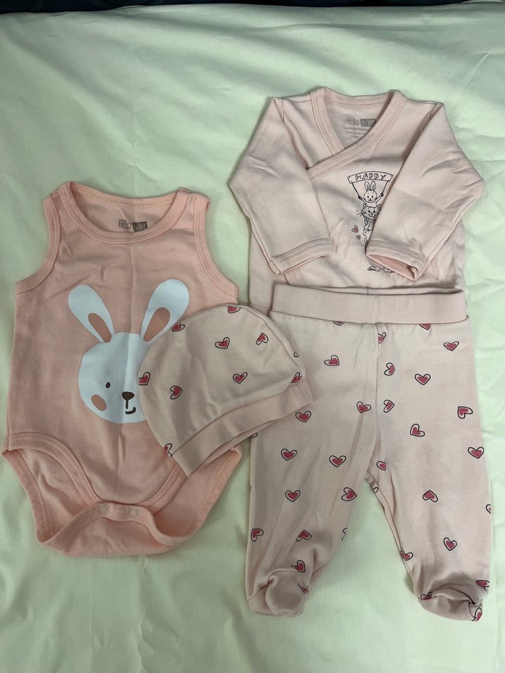 Pastel pembe renkli bebek kız takımı, tavşan baskılı kolsuz body, uzun kollu üst, kalp desenli ayaklı pantolon ve şapka içerir. Zıbınıyla beraber 0-3 aylık