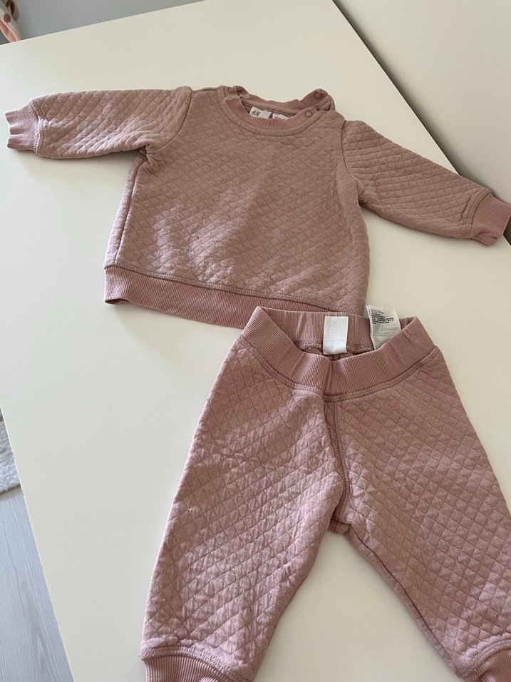 Pembe pastel renkli, örgü ve uzun kollu üst ile uyumlu pantolon içeren bebek kız takımı, yumuşak dokulu ve desenli örülüdür.