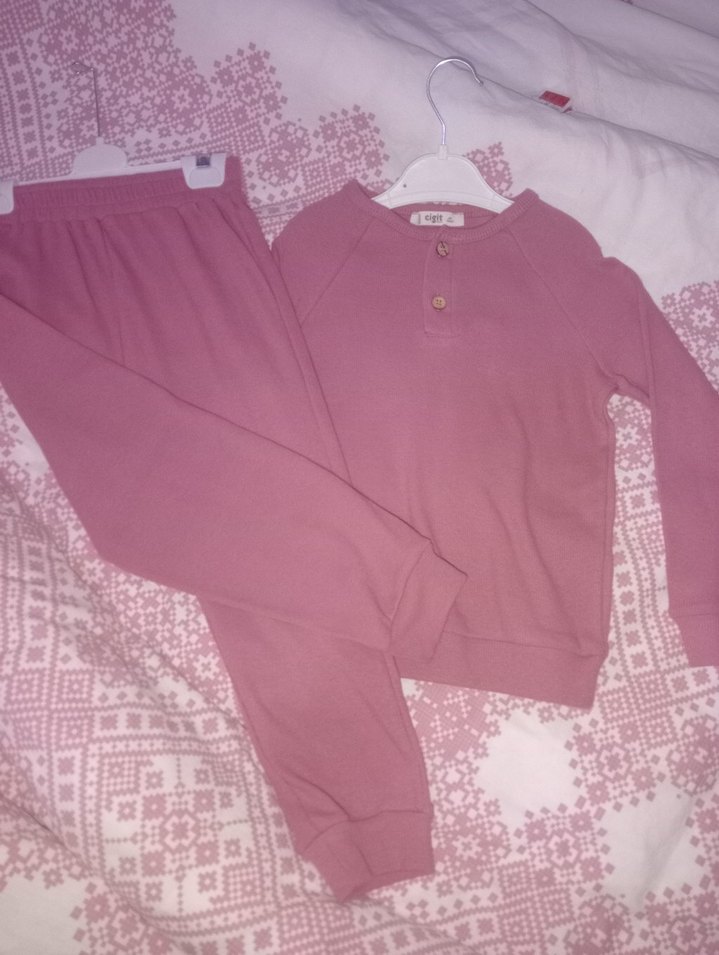 Pastel pembe, uzun kollu ve düğmeli bebek kız takımı. Rahat pantolon ve yumuşak, desensiz üstten oluşur.