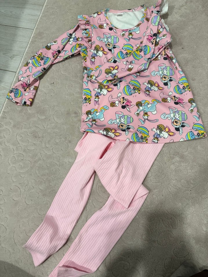 Pembe uzun kollu, renkli çizgi film desenli üst ve pastel pembe triko tayttan oluşan bebek kız takımı. Yumuşak ve konforlu kumaş içerir. 9-10 yaş pamuklu takım hiç kullanılmamıştır