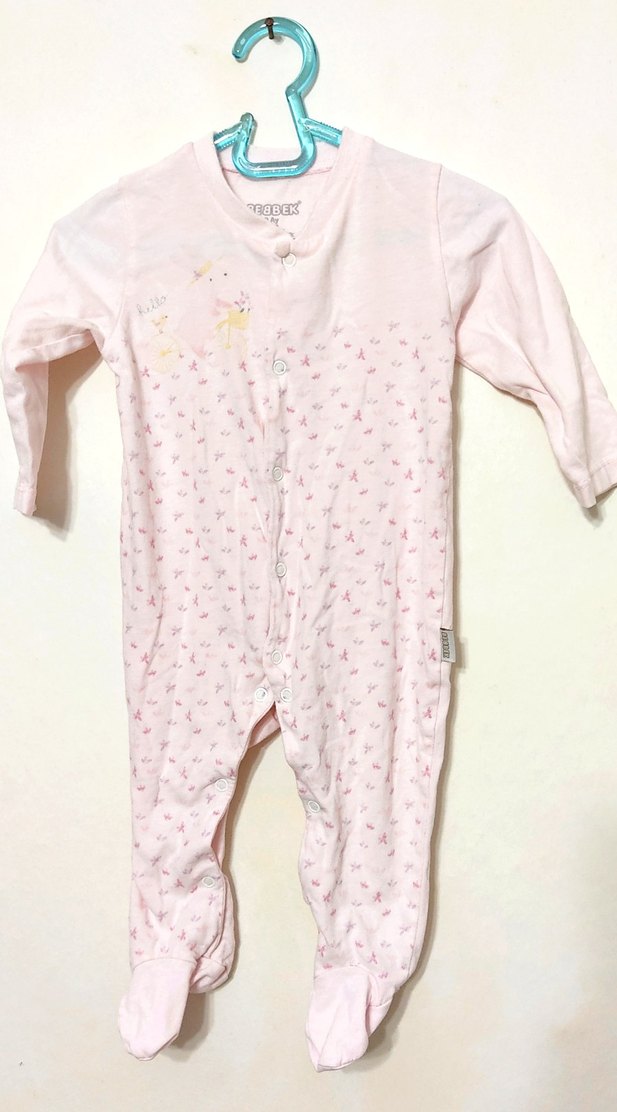 Pastel pembe, uzun kollu, düğmeli bebek kız tulumu. Yumuşak kumaş ve küçük baskılarla rahat kullanım sağlar. 9 ay yazıyor ama 3 aylık bebeğe rahat oluyor.