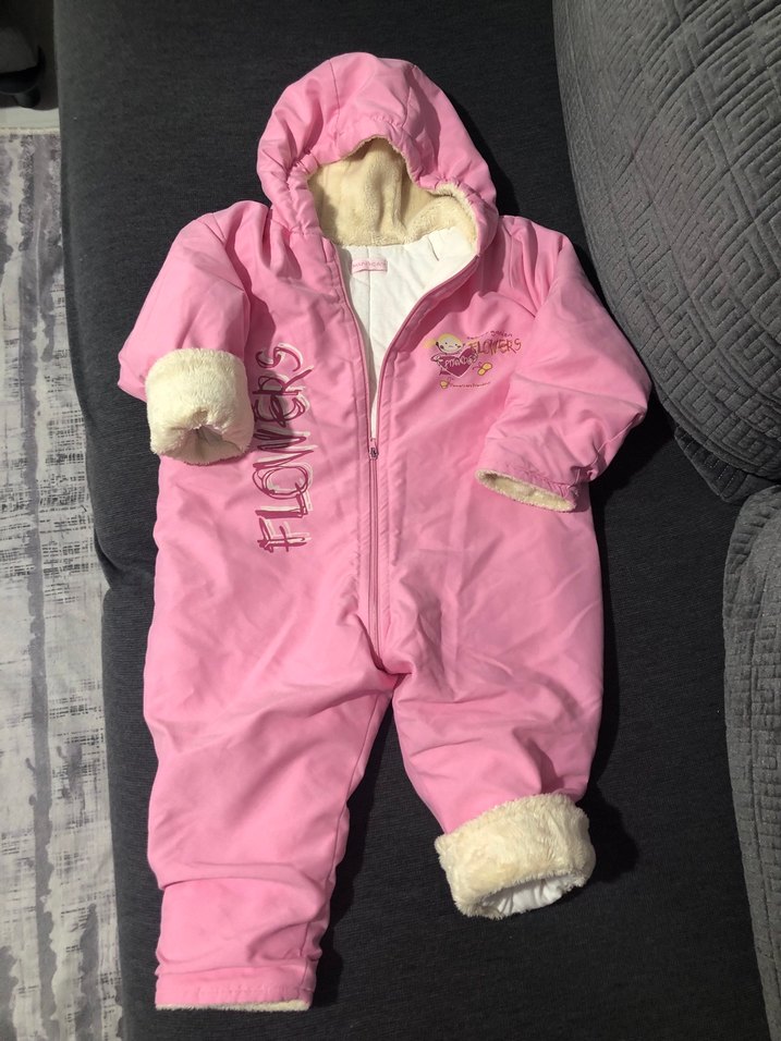 Pembe renkli bebek kız tulumu, kapüşonlu ve kürklü manşet ile astara sahip. Baskılı desen ve fermuarlı. Marka temsilidir. 9 ay 1 yaş 15 aylık bebekler için uygundur