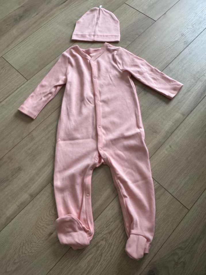 Pastel pembe renkte, uzun kollu ve patikli bebek kız tulumu, yumuşak şapka ile birlikte sunuluyor. Rahat ve şık bir takım.