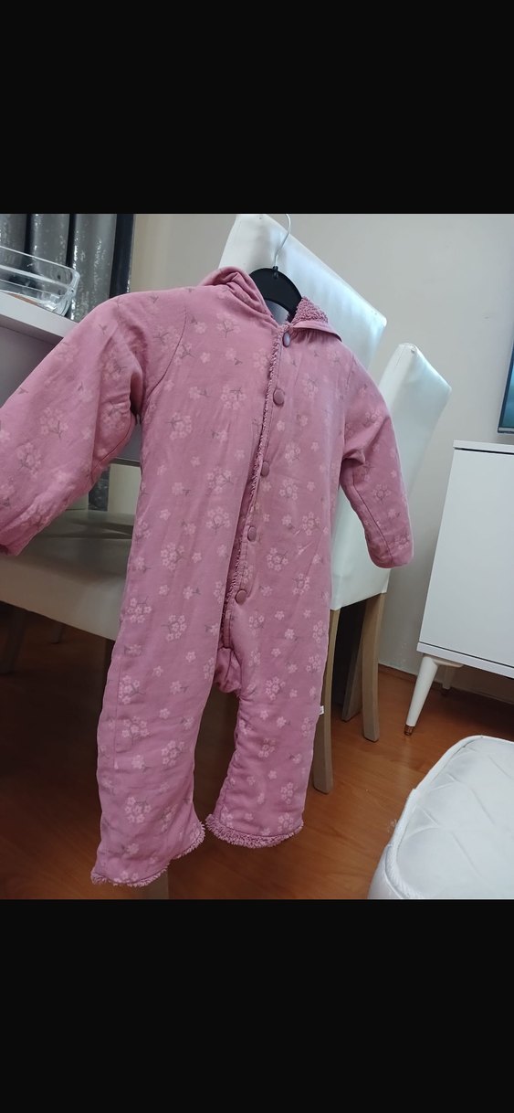 Pastel pembe renkli, düğmeli, yakalı bebek kız tulumu. Yumuşak ve sıcak kumaştan, hafif çiçek desenli, soğuk hava için uygundur. ❄️