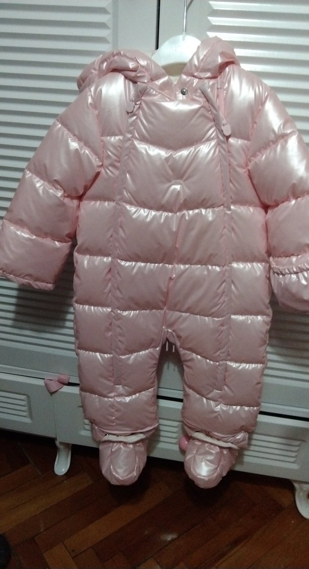 Pastel pembe bebek kız tulumu, fermuarlı ve kesik yaka yakaya sahiptir. Yumuşak ve parlak kumaşlı, eldiven ve patik ekli tam koruma sağlar. ❄️