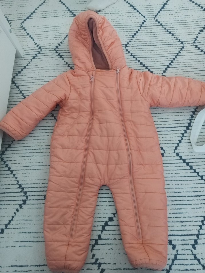 Pastel pembe, kapüşonlu bebek kız tulumu. Çift ön fermuar ve notched lapel yaka detayına sahip, yumuşak ve sıcak kumaştan yapılmıştır. ❄️