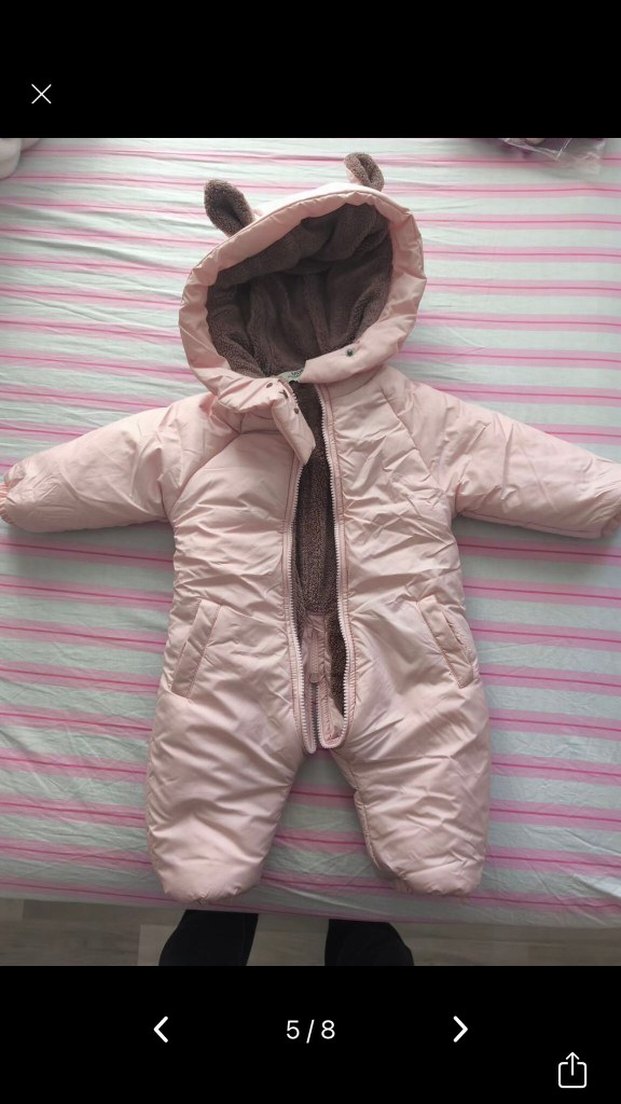 Pastel pembe renkli, fermuarlı, notched lapel yakalı bebek kız tulumu. İç kısmı yumuşak, sıcak kumaşlıdır ve kapüşonunda sevimli kulak detayları bulunur.