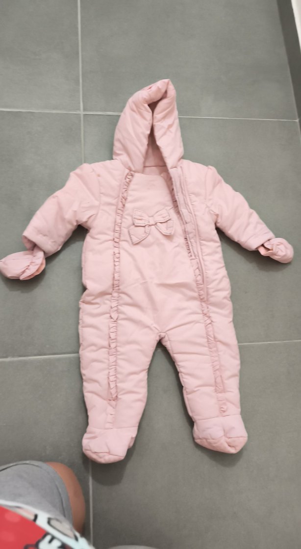 Pastel pembe kapüşonlu bebek kız tulumu, ön kısmında fırfır detaylıdır. Notlu yaka ve eldivenlidir. Yumuşak ve sıcak kumaştan yapılmıştır. ❄️