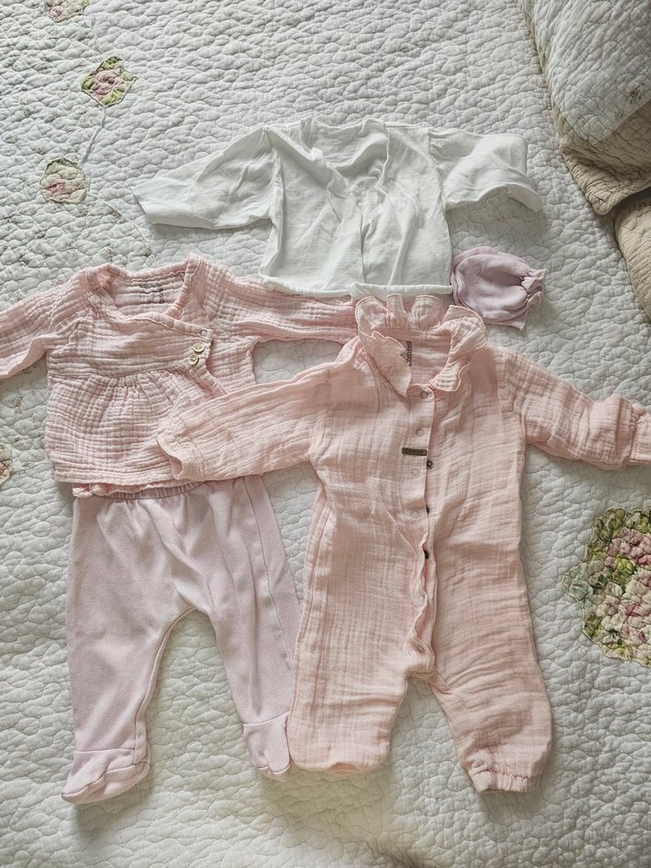 Pastel pembe renkte, uzun kollu bebek kız 5'li takım. Romper, pantolon, üstler ve şapka içerir. Rahat ve şık bir kombin sunar.