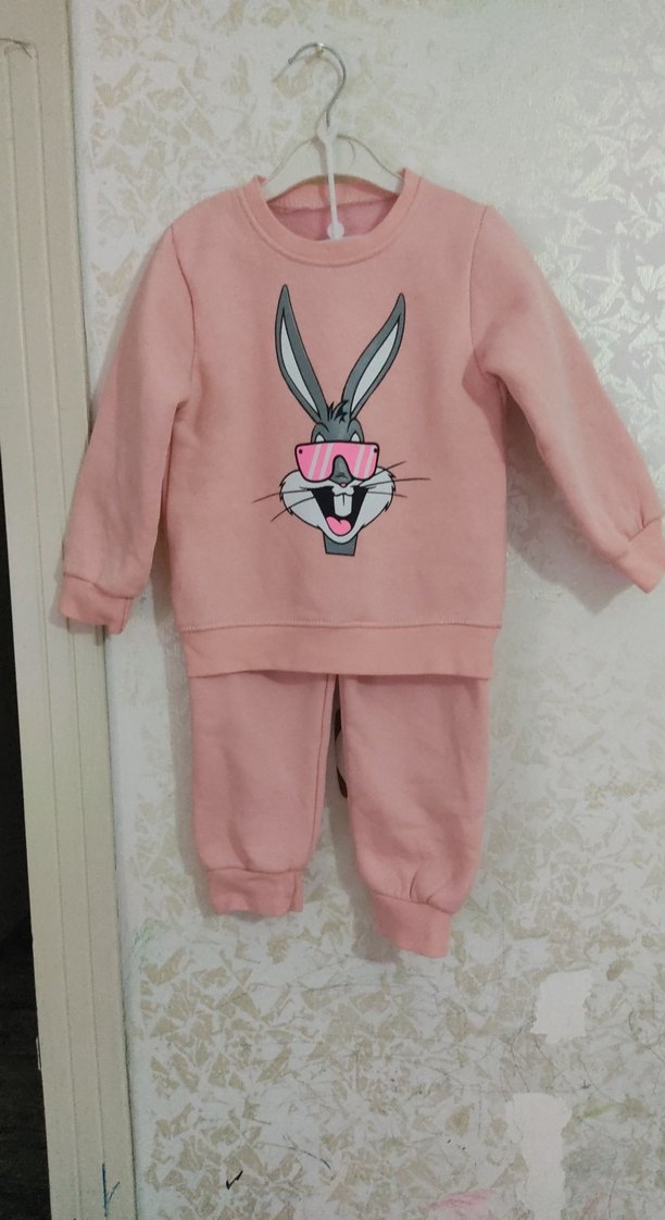 Uzun kollu, pastel pembe renkli bebek kız takımı, baskılı ve kürklü detaylıdır, rahat ve şık bir görünüm sunar. mükemmel görünüyor her hangi bir sorun yok yeni gibi bir defa giydi tiptiklenme yok