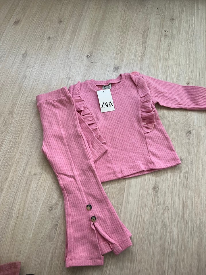 Pastel pembe tonlarda, uzun kollu ve düğmeli bebek kız takımı. Fırfırlı detayları ve sade deseniyle yumuşak dokulu bir set.