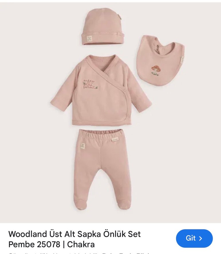 Pastel pembe renkte, uzun kollu üst, patikli alt, şapka ve önlükten oluşan rahat ve şık bebek kıyafet seti.