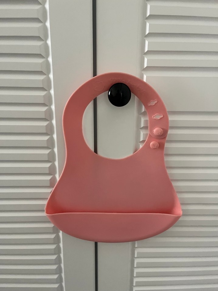 Yemek artıkları için cep bulunan, baskılı desenli pastel pembe bebek mama önlüğü. Beslenme sırasında rahatlık sağlayan yumuşak malzemeden yapılmıştır.