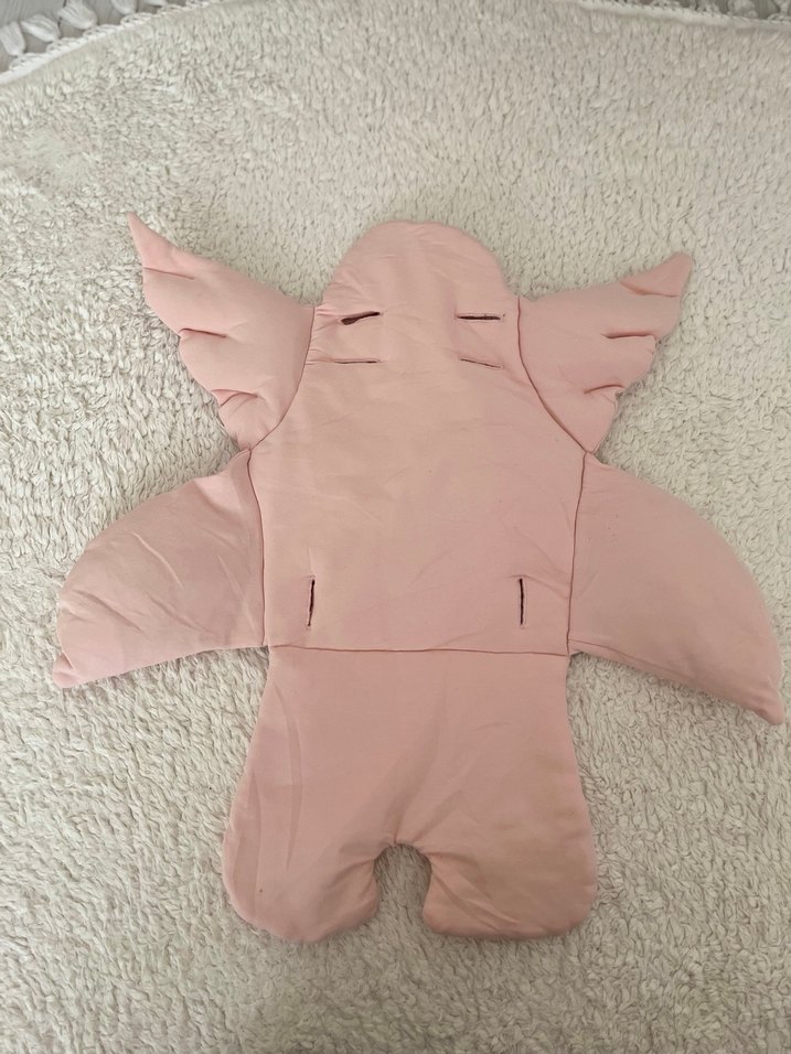 Pastel pembe renkte, yumuşak ve sıcak kumaştan kanat detaylı bebek mama sandalyesi minderi .kemerleri yoktur