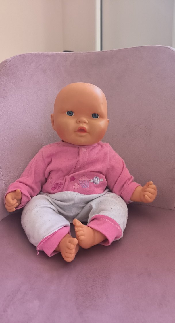 Pastel pembe renkli, rahat kıyafetler giymiş bebek oyuncak. Üstü pembe, altı açık renk pantolonlu, yüz detayları olan yumuşak görünümde.