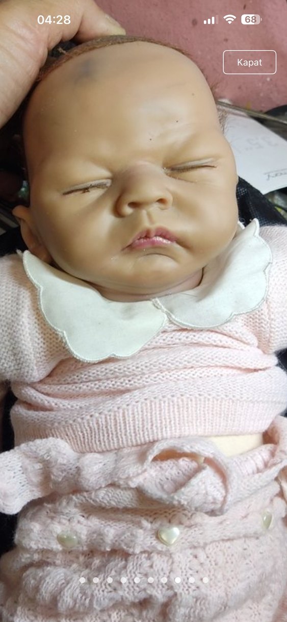 Bu bebek, beyaz yakalı ve pastel pembe yumuşak kıyafetli, gerçekçi uyuyan yüz ifadesine sahip.