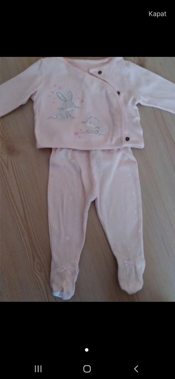 Pastel pembe renkli bebek takımı, uzun kollu ve düğmeli. Üstte sevimli hayvan baskıları, alt pantolon ise ayaklıdır.
