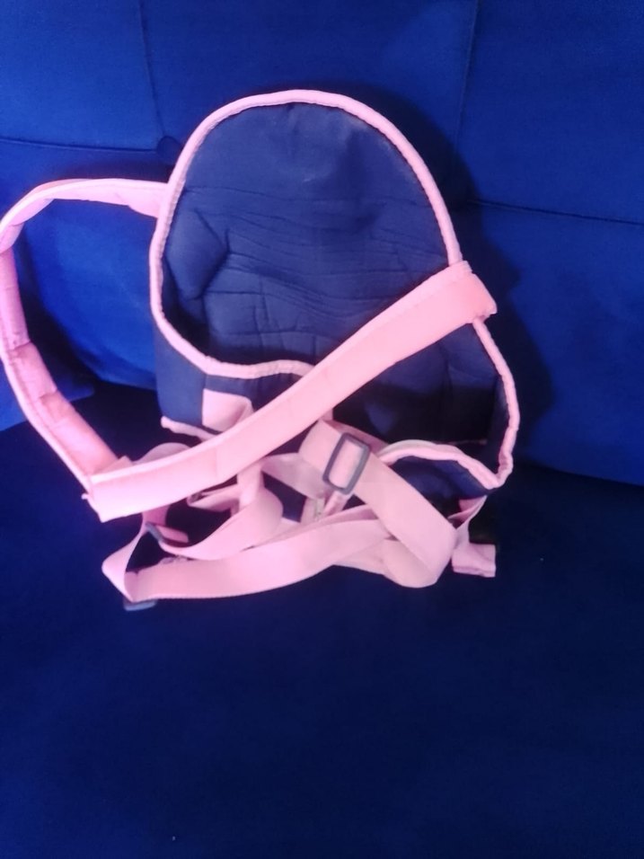 Ayarlanabilir kayışları ve yumuşak kumaşı olan pastel pembe bebek taşıyıcı. Bebekleri güvenle taşımak için uygundur.