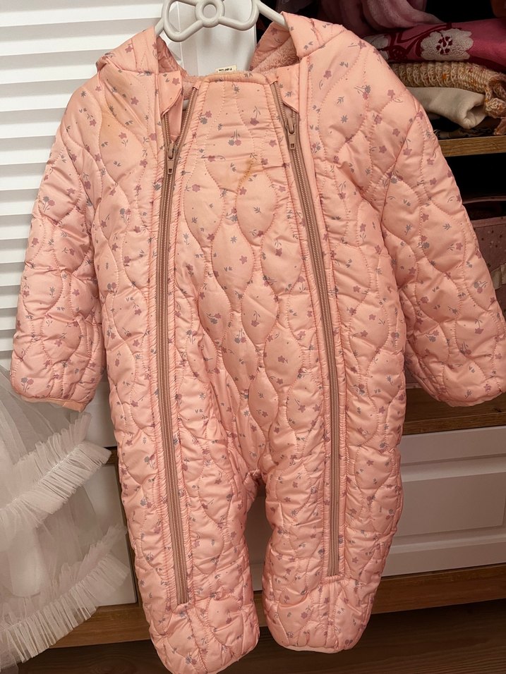 Pastel pembe renkte, kapüşonlu ve çift fermuarlı bebek tulumu. Desensiz, kapitone kumaşı ile sıcak tutar. ❄️