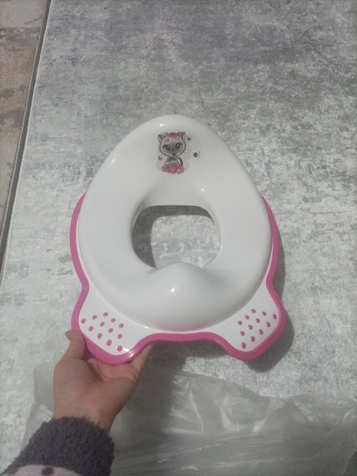 Beyaz ve pembe renklerde, sevimli hayvan desenli bebek tuvalet adaptörü, çocuklar için konfor ve güvenlik sunar.