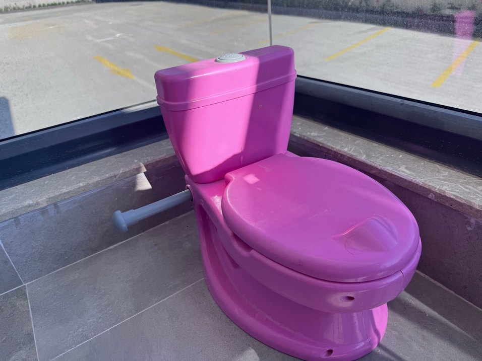 Kapağı ve sifon düğmesi bulunan pembe renkli çocuk tuvaleti, tuvalet eğitiminde kolay kullanım sağlar.