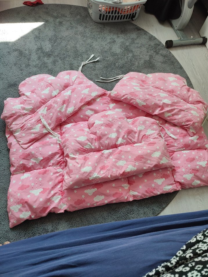 Pastel pembe renkte, yumuşak sentetik kumaştan yapılmış bebek uyku seti. Bulut desenli, bağcıklarıyla sabitlenebilir.