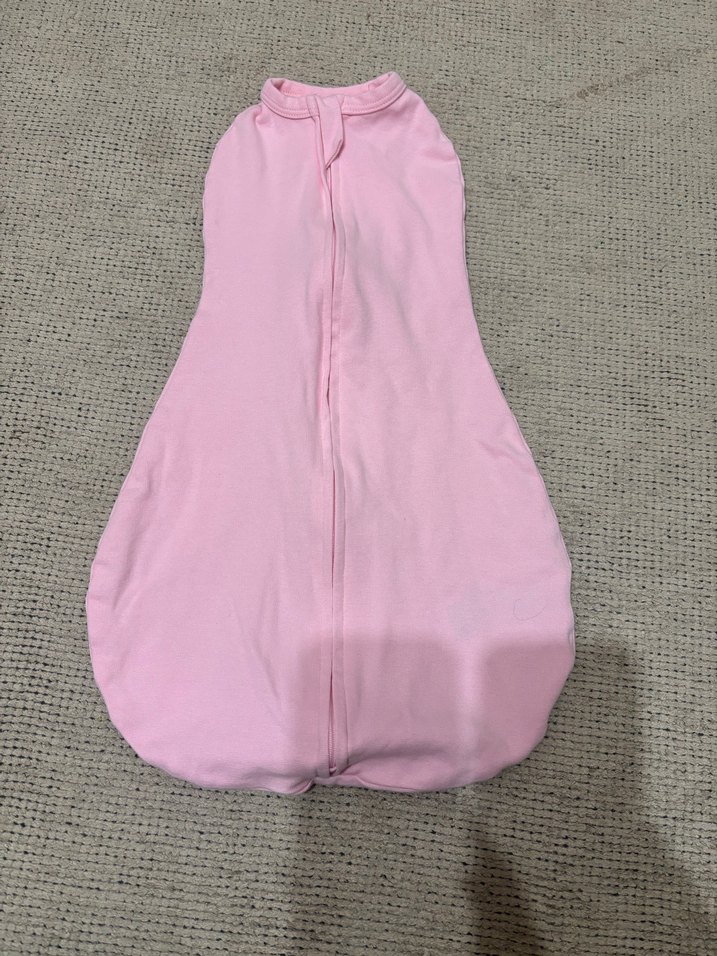 Pastel pembe renkte, yumuşak sentetik kumaştan yapılmış bebek uyku tulumu. Kol kısmı açık ve önünde kolay kullanım için fermuar bulunur.