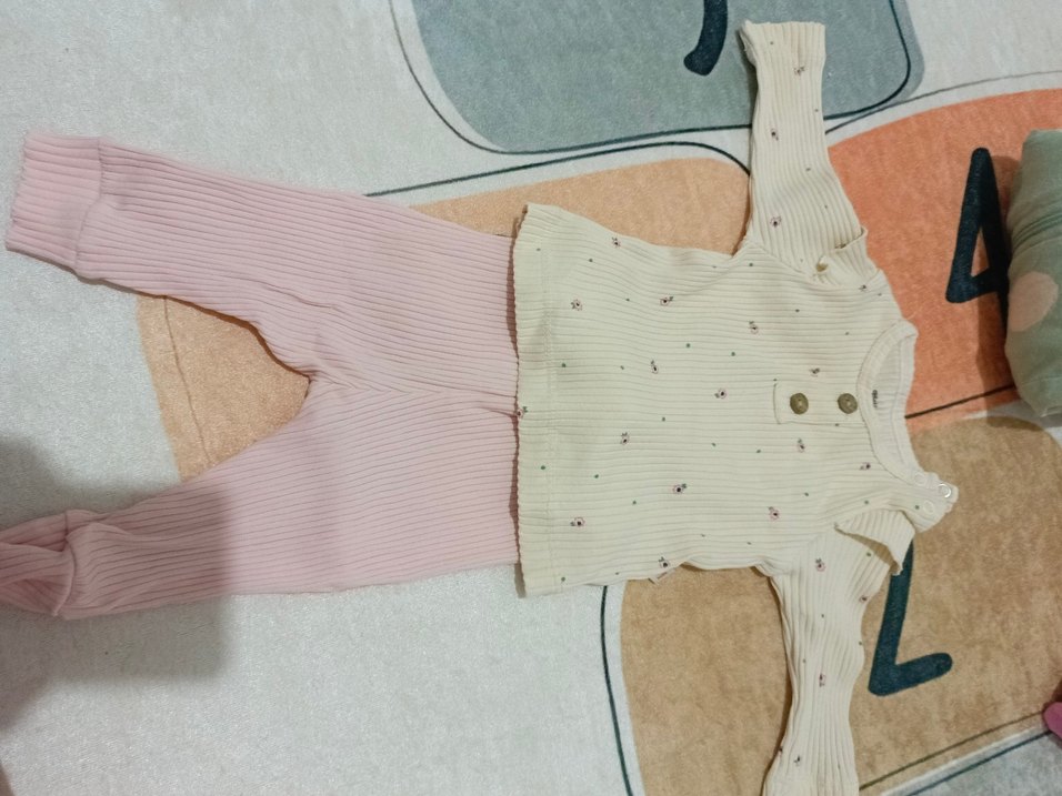 Pastel pembemsi tonlarda, düğmeli uzun kollu üst ve fitilli pantolondan oluşan bebek takımı. Üstü sade ve yumuşak detaylarla tasarlanmıştır.