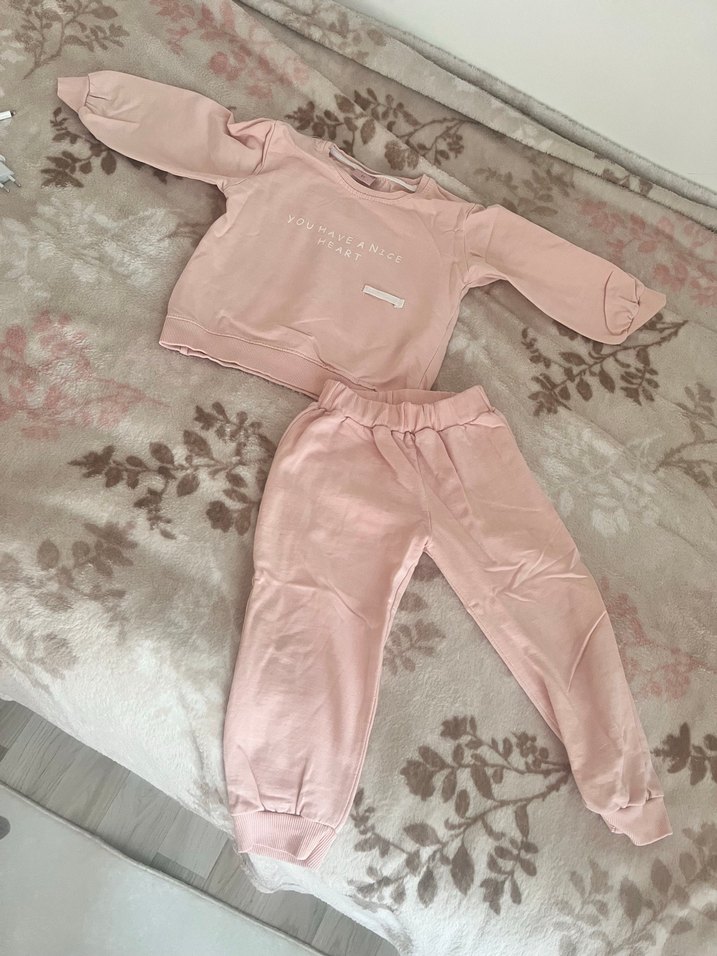 Bebek kız takımı, uzun kollu ve pastel pembe renkte, desensiz ve rahat şıklık sunar. 5 yaş yazıyor ama kızım 3 yaşında giydi sorunu yoktur