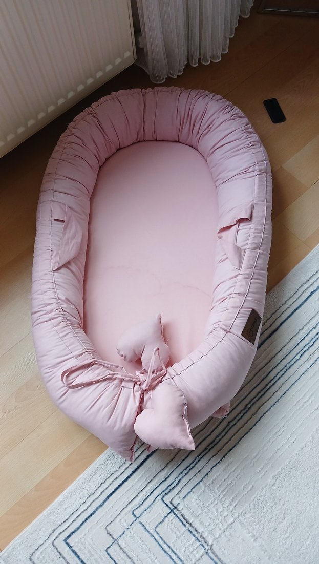 Yumuşak sentetik kumaştan yapılmış, pastel pembe renkte bebek yatağı minderi. Desensiz ve bebekler için rahat uyku sağlar. ️