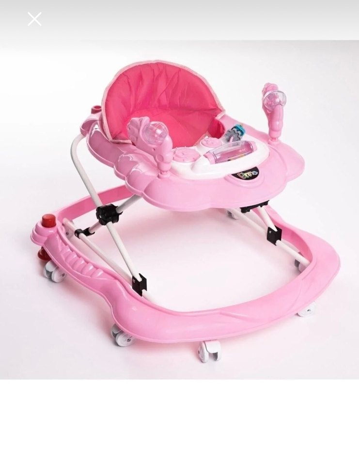 Pembe renkli, renkli oyun panelli ve rahat oturma yastıklı bebek yürüteci, yürümeye destek sağlar. Müzik aksamı bozuktur sağlam ve temizdir az kullanıldı