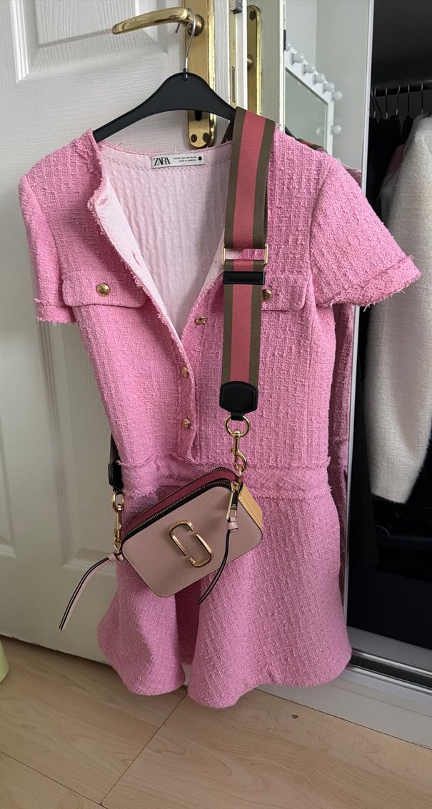 Pembe altın sarı düğmeli mini elbise, enerji veren ve ışıltı katan bir hava istediğiniz günde giyebilirsiniz.