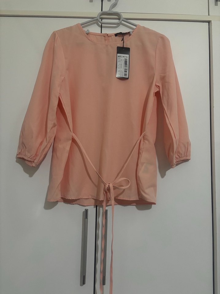 Pembe tonlarda, uzun kollu ve bisiklet yaka tasarıma sahip, beli bağlamalı ve bol kesimli sentetik kumaştan yapılmış bluz. Rahat ve şık bir görünüm sunar.