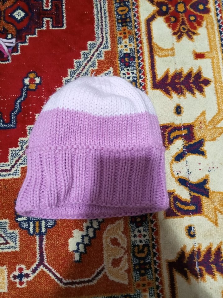 Kadınlar için pembe ve beyaz renklerde örgü tasarıma sahip, rahat ve sade tarzda bere.