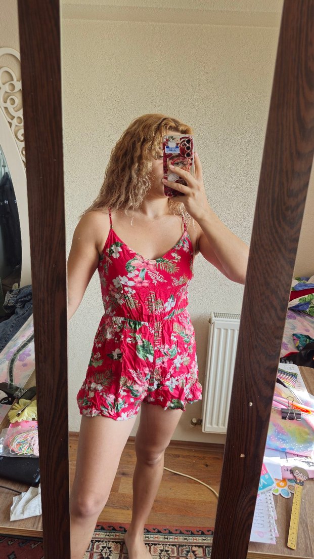 Pembe çiçek desenli, askılı, kısa ve dar kesim kadın tulumu. Sentetik kumaştan, günlük kullanıma uygun. #bershka #pullandbear