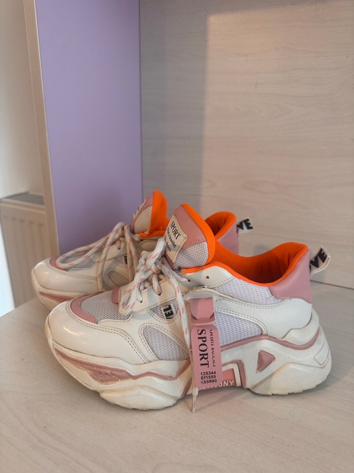 Pembe pastel tonlarında, bağcıklı ve dolgu topuklu spor ayakkabılar. Baskılı detaylar ve sportif tarz sunar. 2 kere giyildi boyu kısa olanlar iyi bir alternatif . 37 numara ama Elimde 38 39 numarada mevcuttur.