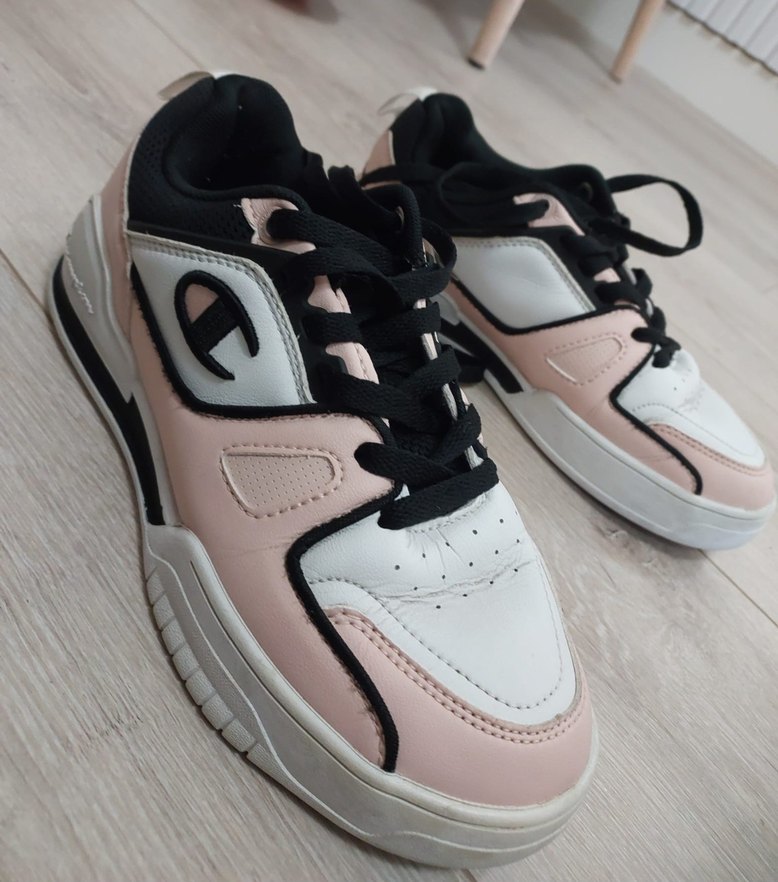 Pastel pembe ve beyaz renkte, bağcıklı ve blok topuklu kadın spor ayakkabısıdır. Kauçuk taban dayanıklılık sağlar.