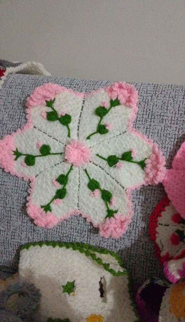 Pembe ve beyaz renklerde, yeşil detaylı çiçek motifli el örgüsü Yumuşak dokulu, lif