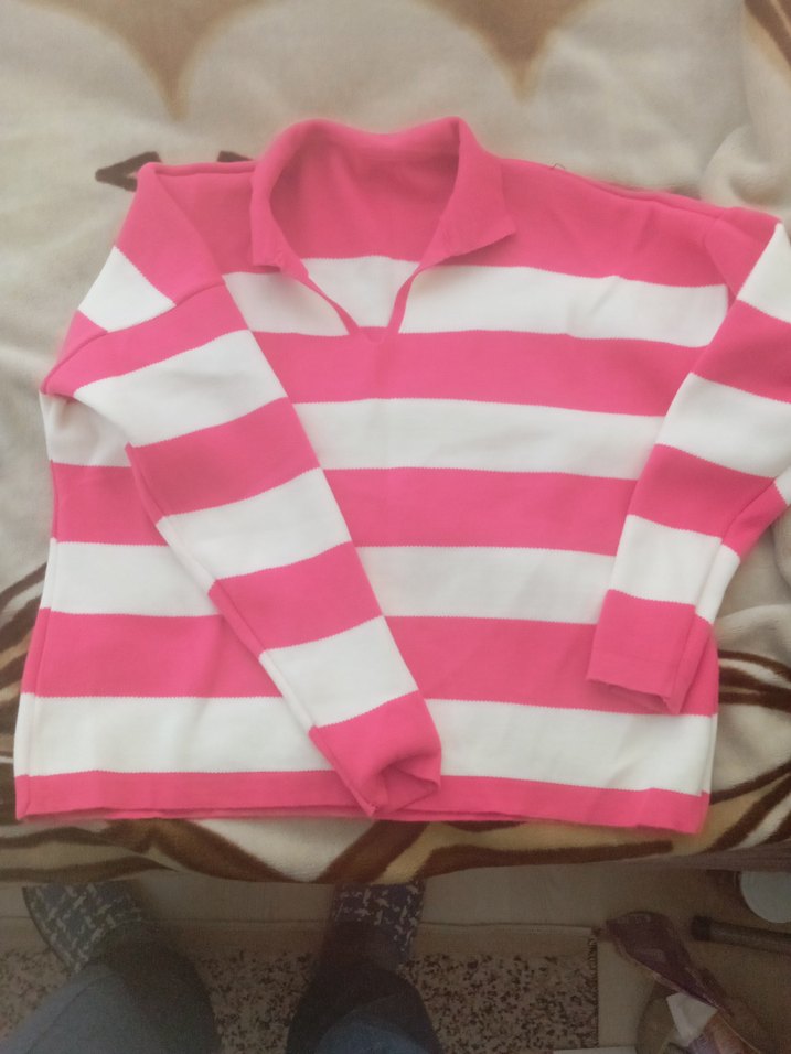 Uzun kollu, polo yaka ve kadın triko kazak. Yumuşak ve sıcak dokulu, pembe beyaz çizgili, günlük rahat stil için uygundur. 40 42 uyumlu