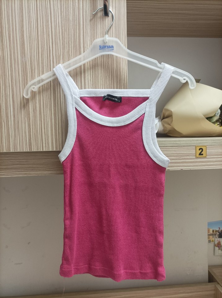 Pembe renkli, beyaz detaylı, askısız yakalı ve normal midi boyda, yumuşak sentetik kumaştan kadın atlet. Rahat ve şık günlük sokak stili için uygun.