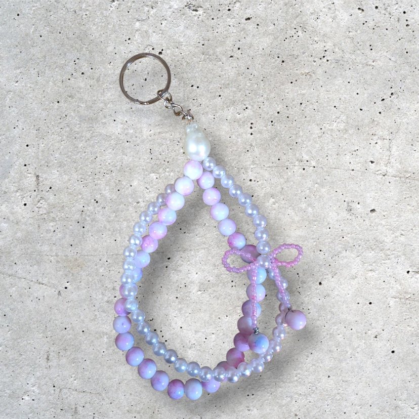 Pembe-beyaz renkte boncuklarla tasarlanmış, minimal tarzda ve zarif fiyonk detayı bulunan anahtarlık.