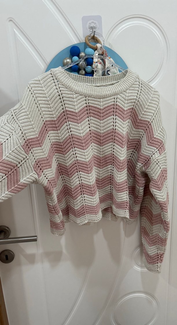 Pembe ve beyaz zigzag desenli, uzun kollu örgü kadın kazak. Salaş kesimi ve yuvarlak yakasıyla rahat ve bohem tarz sunar.