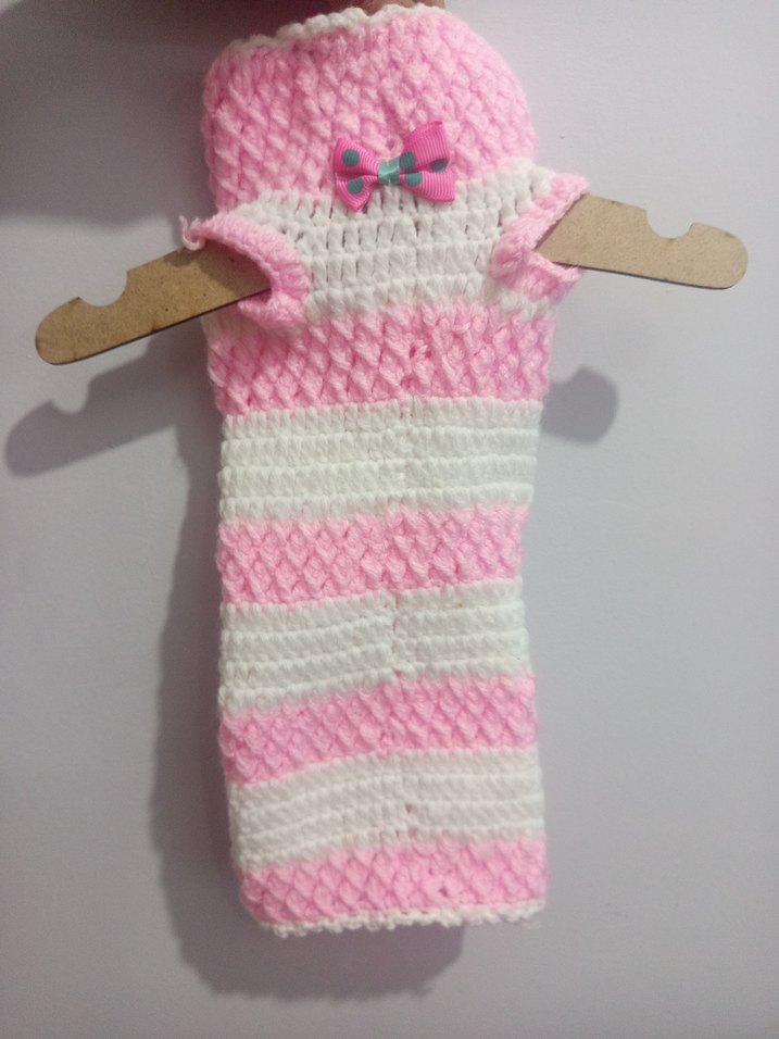 Pastel pembe ve beyaz renklerde, örgü bohem tarzı kedi kıyafeti. Küçük fiyonk detayıyla yumuşak ve rahat.