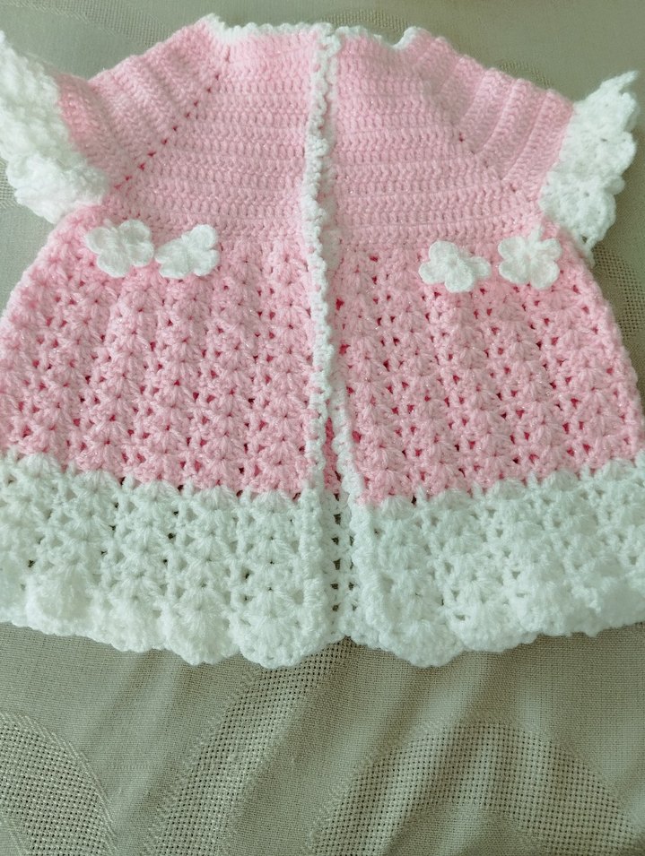 Pembe ve beyaz renklerde, uzun kollu, çiçek detaylı örgü kız hırkası. Rahat ve bol kesimdir.