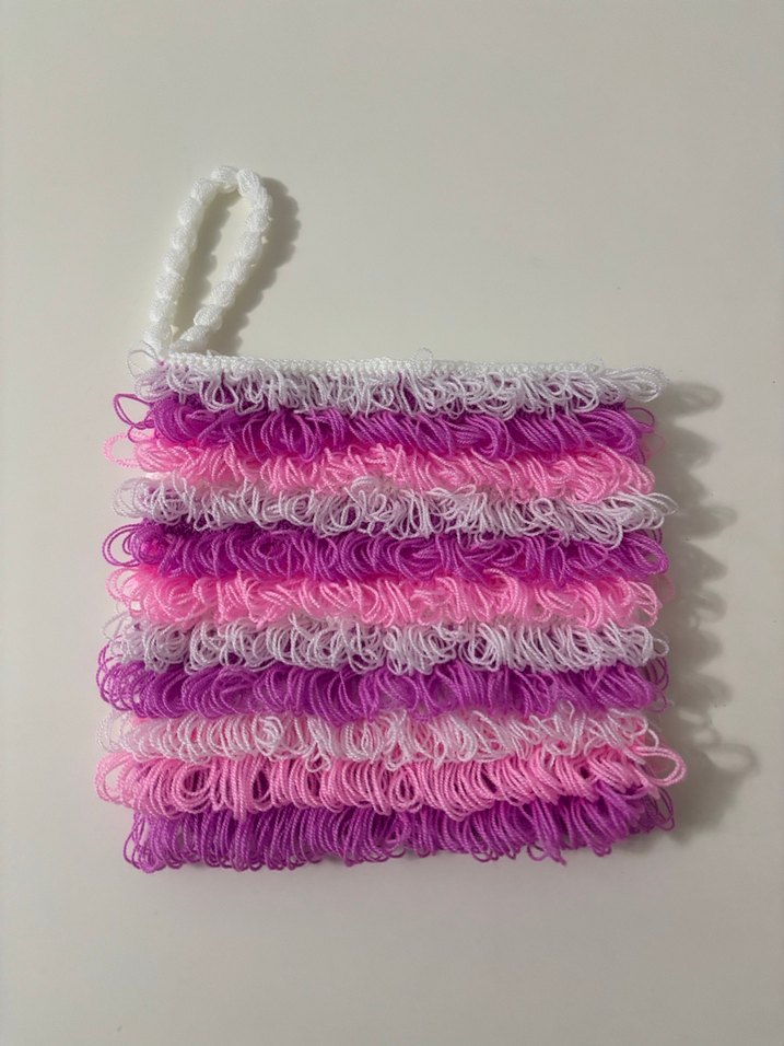 Asma halkalı, canlı pembe ve beyaz tonlarında renkli banyo süngeri.